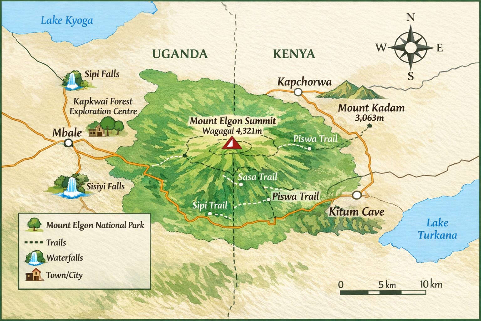 Maps of Mount Elgon help visitors understand the mountain’s geography, major hiking routes, and surrounding attractions. Key features commonly highlighted include Wagagai Peak, the highest point on the Ugandan side of the mountain, as well as important trekking routes such as the Sasa Trail, Piswa Trail, and Sipi Trail. These routes guide hikers through diverse environments ranging from dense montane forests and bamboo zones to moorlands and alpine landscapes.
